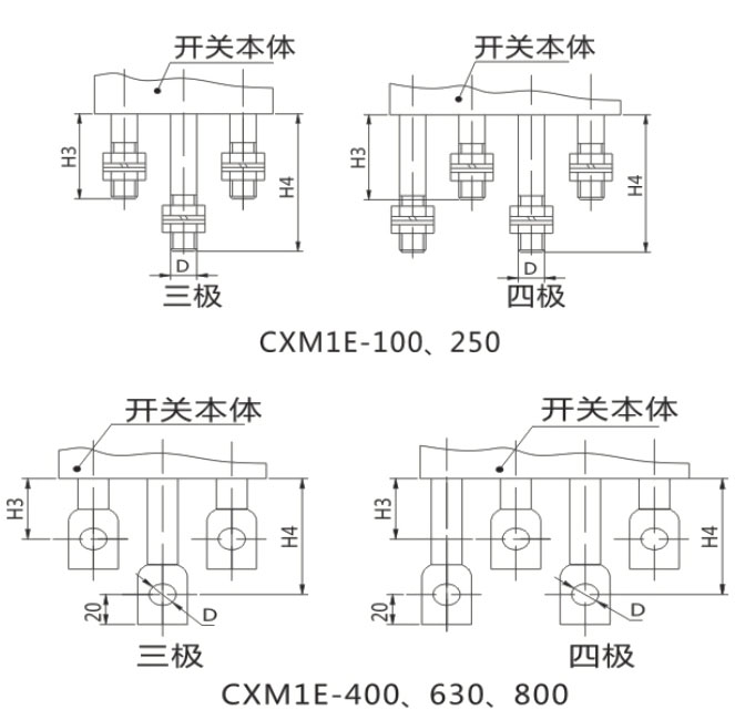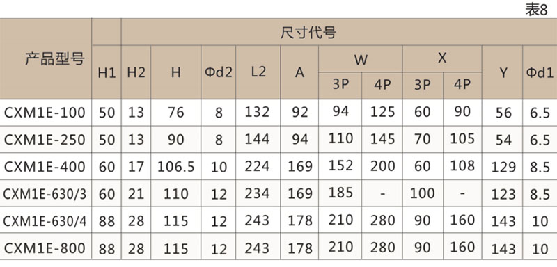 2,CXM1E-400中328,CXM1E-630、800中348規(guī)格,CXM1E-400、CXM1E-630、CXM1E-800中368規(guī)格輔助觸頭為三對觸頭(即三常開,三常閉),