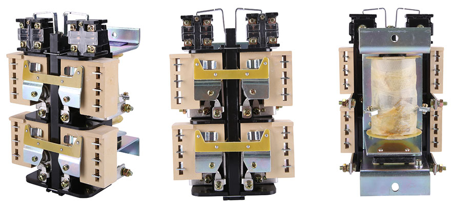 250A及以上的接觸器為平面布置結(jié)構(gòu),我公司在統(tǒng)一設(shè)計的基礎(chǔ)上進(jìn)行改型設(shè)計,銜鐵棱角轉(zhuǎn)動改為軸承結(jié)構(gòu)。輔助開關(guān)由銜鐵擺機(jī)構(gòu),改為平行滑動。吸引線圈為雙繞組線圈。主觸頭系統(tǒng)為繞轉(zhuǎn)軸轉(zhuǎn)動的指形單斷點串聯(lián)吹滅弧裝置。