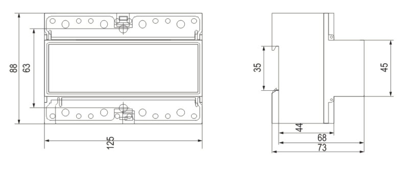 1.35 mm DIN標(biāo)準(zhǔn)導(dǎo)軌安裝,符合 DIN EN50022標(biāo)準(zhǔn),或者板前式安裝(安裝孔中心距63mm)兩種安裝方式可由用戶任意選擇