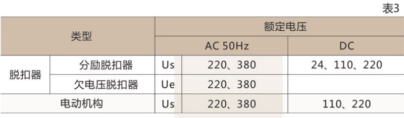 分勵脫扣器及電動機構(gòu)的額定控制電源電壓(Us)和欠電壓脫扣器的額定工作電壓(Ue)