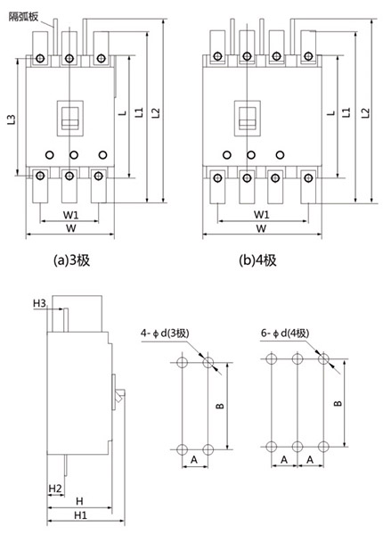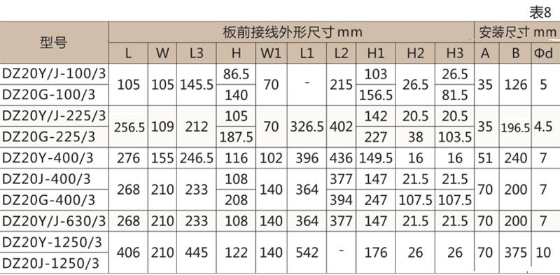 斷路器的外形安裝尺寸見圖1a、圖1b和表8