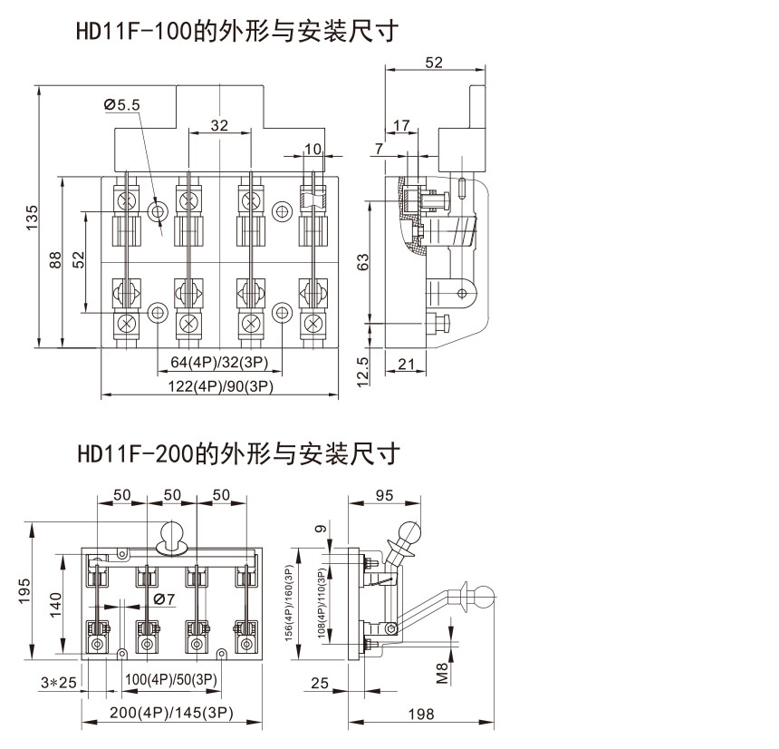 HD11F-100、200刀開關(光伏款),適用于交流50Hz、額定電壓交流AC400V、直流DC500V(3P)/DC750V(4P)、約定發(fā)熱電流至200A的成套配電裝置中。