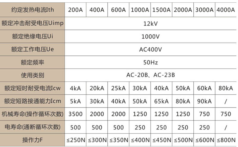 注:類別AC-23B、短路接通能力、電壽命,僅帶滅弧罩的刀開關(guān)才有。