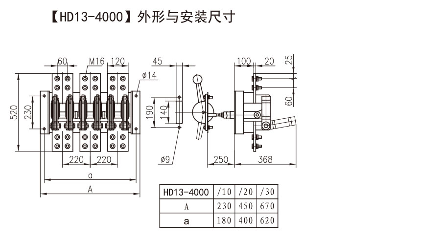 ● 中央正面杠桿傳動(dòng)式的刀開關(guān),為了便于開關(guān)板的設(shè)計(jì)和安裝,從200-4000A的縱向安裝尺寸皆相同。