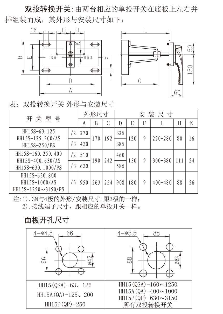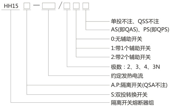 HH15(QA)系列隔離開關(guān)熔斷器組,HH15A(QA)、HH15P(QP)系列隔離開關(guān),HH15S(QSS)、HH15S(QAS)、HH15S(QPS)系列雙投轉(zhuǎn)換開關(guān)(以下簡稱開關(guān)),適用于交流50Hz、額定電壓400V、約定發(fā)熱電流至3150A的具有高短路電流的配電電路和電動機(jī)電路中,用作手動不頻繁操作的主開關(guān)或總開關(guān),其中QSA、QSS系列開關(guān)可作電路短路保護(hù)之用。