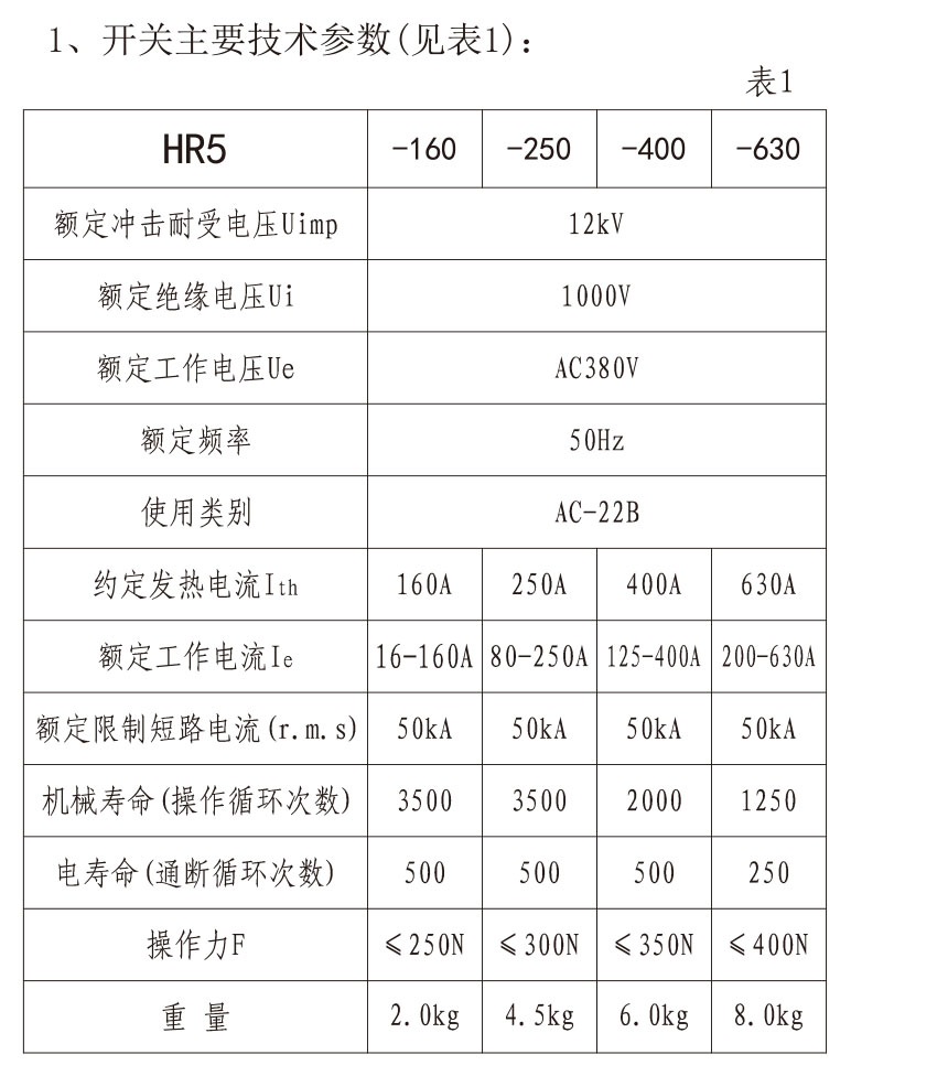 HR5系列熔斷器式隔離開(kāi)關(guān)(以下簡(jiǎn)稱開(kāi)關(guān)),適用于交流50Hz、額定電壓380V、約定發(fā)熱電流至630A的具有高短路電流的配電電路和電動(dòng)機(jī)電路中,用作手動(dòng)不頻繁操作的電源開(kāi)關(guān)、隔離開(kāi)關(guān)和應(yīng)急開(kāi)關(guān),并作為電路短路保護(hù)之用,但一般不作為直接開(kāi)閉單臺(tái)電動(dòng)機(jī)之用。