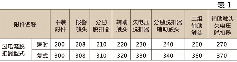 ●脫扣方式及附件代號(見表1):訂貨日囗不注明一律按不裝附件(即3300)供貨:當(dāng)訂購帶分勵脫扣