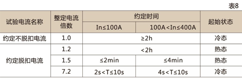 電動機保護用斷路器在周圍空氣溫度為+40℃±2℃時,各極同時通電時,無溫度補償?shù)姆磿r限斷開特性見表8。