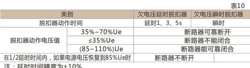 ● 斷路器的欠電壓脫扣器性能見表10