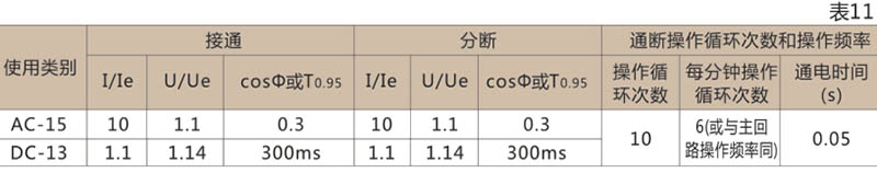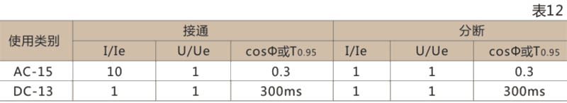 ● 輔助觸頭正常條件下的接通與分段能力見表12
