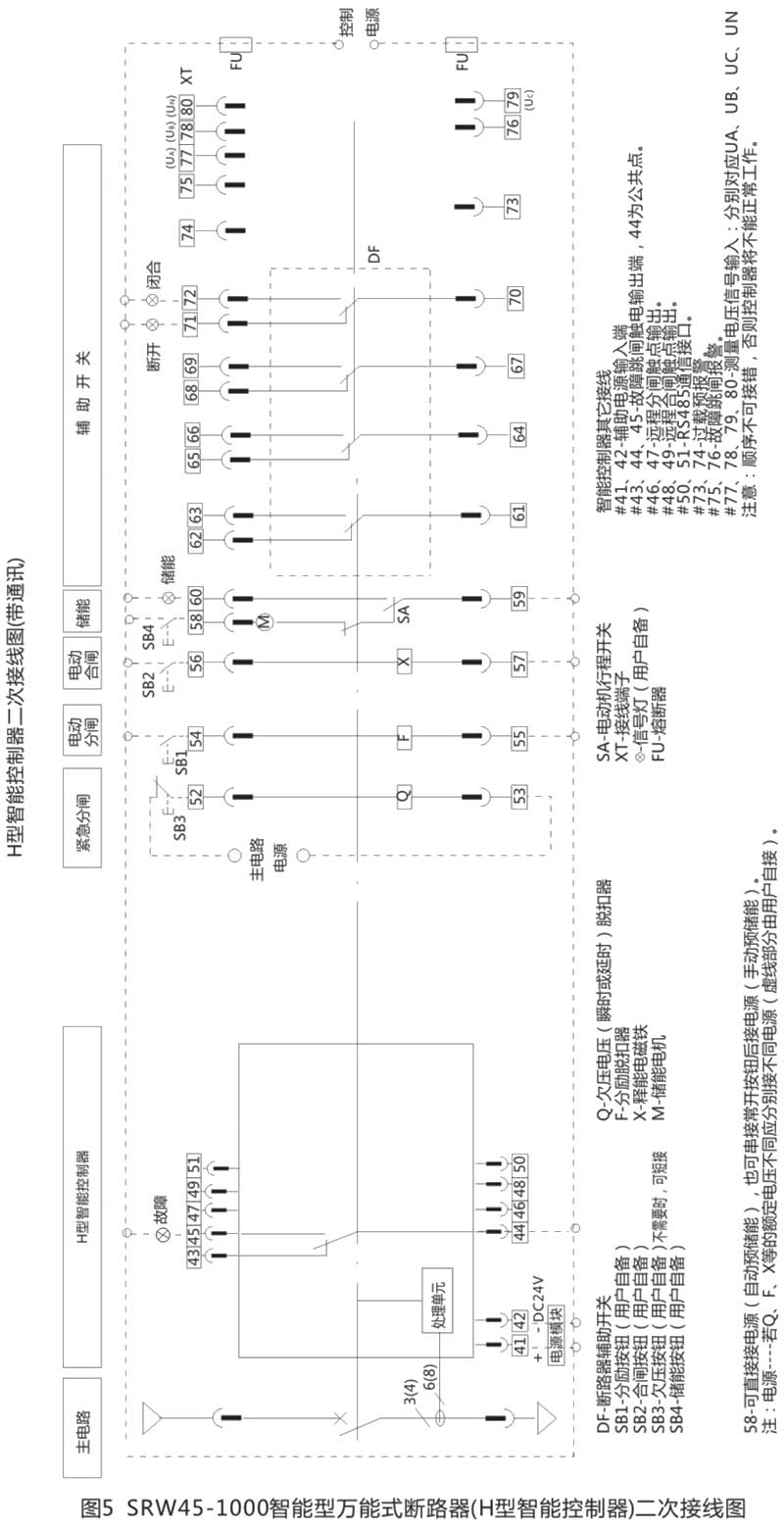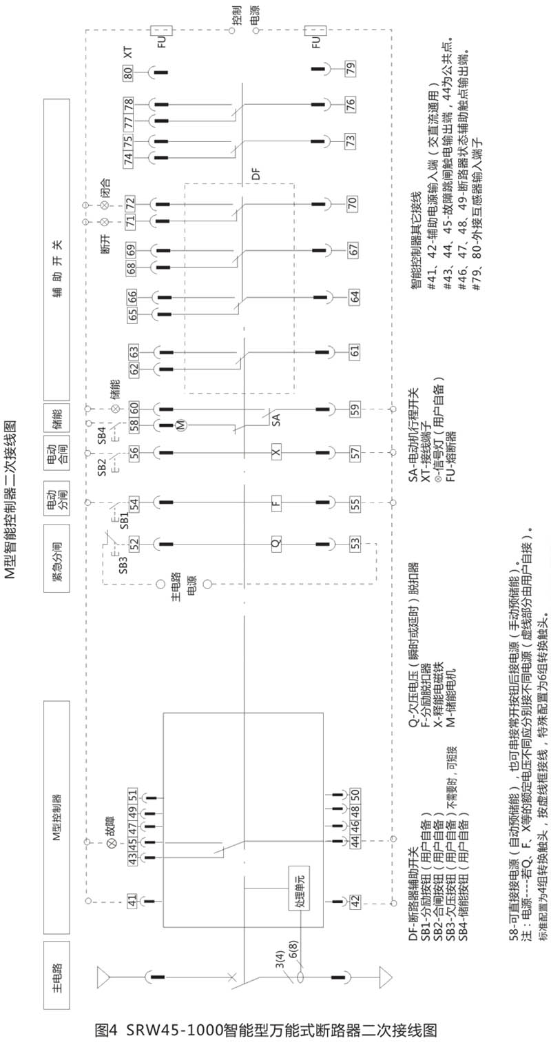斷路器共有40個(gè)接線端子,接線圖見圖5,、圖6、圖7、圖8所示。