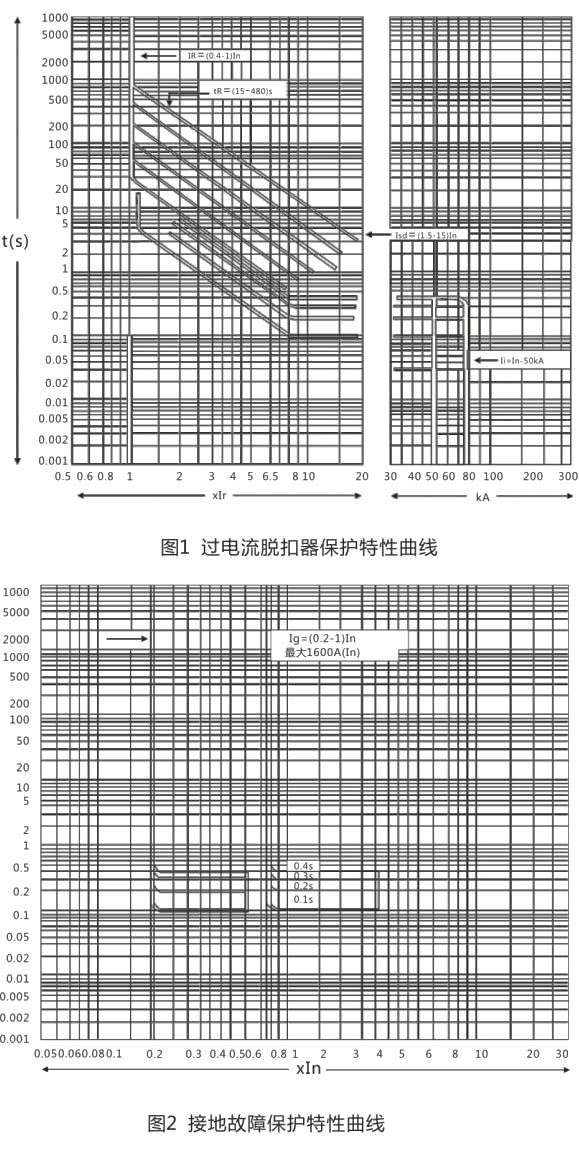 ● 斷路器過電流保護(hù)特性,接地故障保護(hù)特性曲線見圖1所示