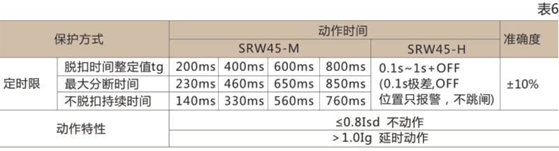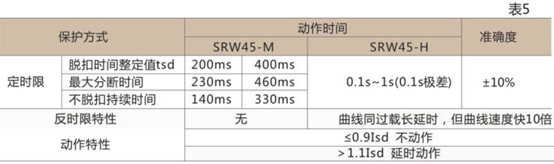 I2TS(8IR)2(式中TS)為短延時(shí)整定時(shí)間,tsd為短延時(shí)動作時(shí)間,當(dāng)過載電流>8IR,自動轉(zhuǎn)換為定時(shí)限特性,其動作特性見表5。