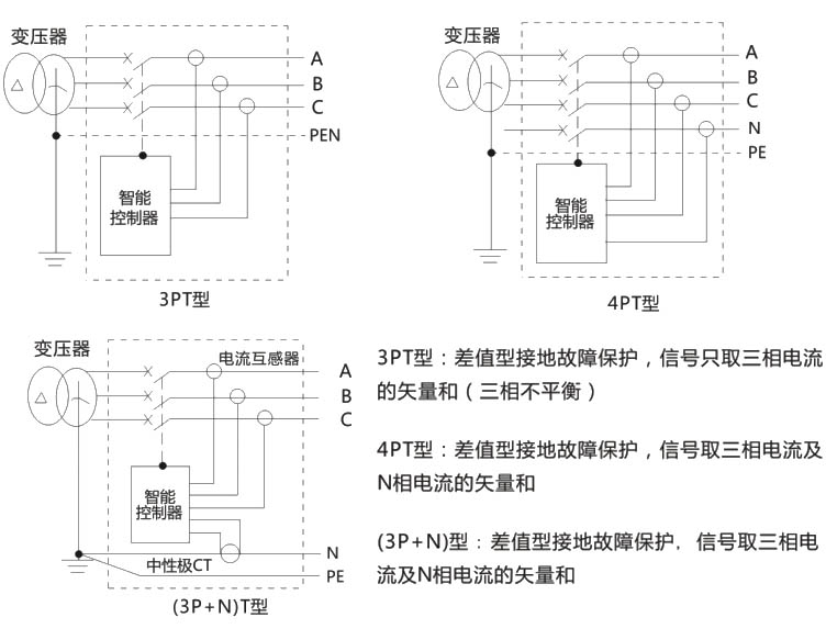 接地保護(hù)是控制器根據(jù)三相電流和中性電流矢量和進(jìn)行保護(hù),根據(jù)斷路器極數(shù)分為3PT、4PT(3P+N)T三種保護(hù)方式(見圖3)