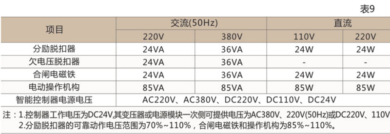 ● 斷路器的分勵(lì)脫扣、欠電壓脫扣器、電機(jī)操作機(jī)構(gòu)、釋能(合閘)電磁鐵、智能控制器的工作電壓及所需功耗見表9