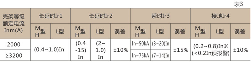 ※當(dāng)額定電流為4000A,5000A時,允許范圍(0.2~0.7)In;6300A時為(0.2~0.6)In,整定時不得超出此范圍。