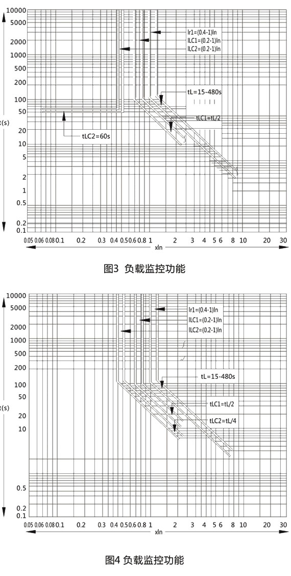 設(shè)置兩個整定值,ILcl整定范圍(0.2-1)ln,ILc2整定范圍(0.2-1)In。ILc1延時特性為反時限特性,其時間整定值為延時整定值的1/2;ILc2延時特性有兩種:第一種為反時限特性,其時間整定值為長延時整定值1/4,第二種為定時限,其延時間為60s,這二種延時功能,前者用于當(dāng)電流接近過載整定值分?jǐn)嘞录壊恢匾?fù)載,后者則用于當(dāng)電流超過ILc1整定值,使延時分?jǐn)嘞录壊恢匾?fù)載后,電流下降,使主電路和重要負(fù)荷電路保持供電,當(dāng)電流下降到ILc2時,經(jīng)一定延時后發(fā)出指令再次接通下級已切除的電路,恢復(fù)整個系統(tǒng)的供電。上述兩種監(jiān)控保護,用戶可任選其一。監(jiān)控特性見圖3,圖4。