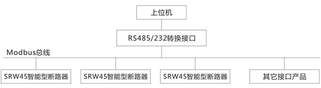 除了具有M型所有功能外,同時具有RS485標(biāo)準(zhǔn)通訊接口(標(biāo)準(zhǔn)配置為 Modbus通訊協(xié)議),可半雙工或全雙工通訊,通過通訊接口可組成主從結(jié)構(gòu)的局域系統(tǒng)(以下簡稱系統(tǒng)),由1-2臺計算機作為主站,若干智能斷路器或其他可通訊元件作為從站,系統(tǒng)網(wǎng)絡(luò)結(jié)構(gòu)如下圖所示。針對斷路器單元,系統(tǒng)可實現(xiàn)遠距離”四遙”功能:多種電網(wǎng)參數(shù)和運行參數(shù)的監(jiān)測,智能斷路器當(dāng)前運行狀態(tài)監(jiān)視,各種保護限值參數(shù)的調(diào)整和下載,智能斷路器的合、分操作控制等。系統(tǒng)適用于各種電站、發(fā)電廠、中小型變電所、工礦企業(yè),樓宇等配電控制系統(tǒng)建設(shè)和改造。例: Modbus通訊協(xié)議接口的連接關(guān)系圖如下: