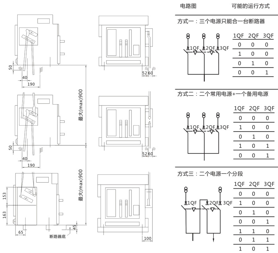 注:斷路器的聯(lián)鎖機構(gòu)適合抽屜式、固定式。用戶可單獨采用聯(lián)鎖機構(gòu)進行二臺或三臺的轉(zhuǎn)換,也可選配本公司SRW45系列NQ6W-A雙電源自動切換裝置,以實現(xiàn)雙路供電自動切換。
