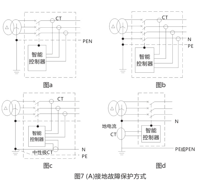 控制器分兩種不同保護方式,一種為差值型(T),控制器根據(jù)三相電流和中性線上電流矢量和進行保護。根據(jù)斷路器極數(shù)又分為3PT、4PT、(3P+N)T三種形式,分別見下圖(a、b、c),另一種方式為地電流型(W),控制器直接取主電源的中性點與地之間的一個附加電流互感器的輸出電流信號進行保護,互感器在N線與PE線之間,見下圖d。