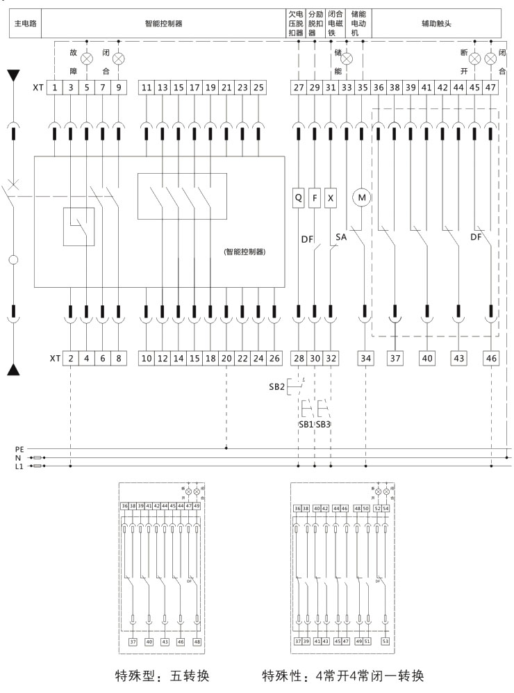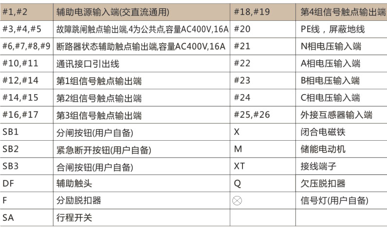 ● 斷路器總體接線端子共47個,接線簡單,便于用戶接線,接線圖見圖8,其端子號和外加附件的含義見附表。